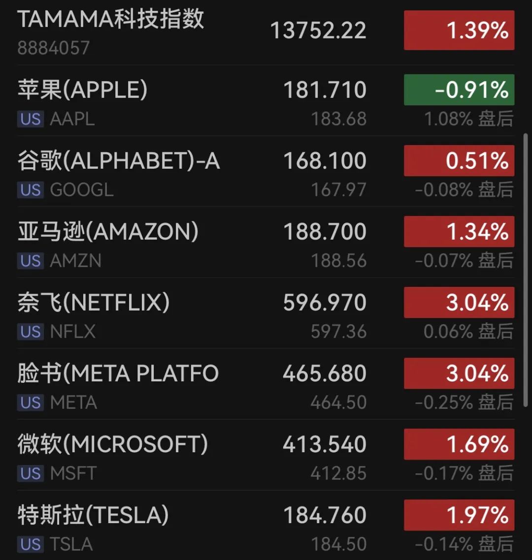 科技股多数上涨,万得美国TAMAMA科技指数涨1.39%,特斯拉涨1.97%,苹果跌0.91%,亚马逊涨1.34%,奈飞涨3.04%,谷歌涨0.51%,脸书涨3.04%,微软涨1.69%。