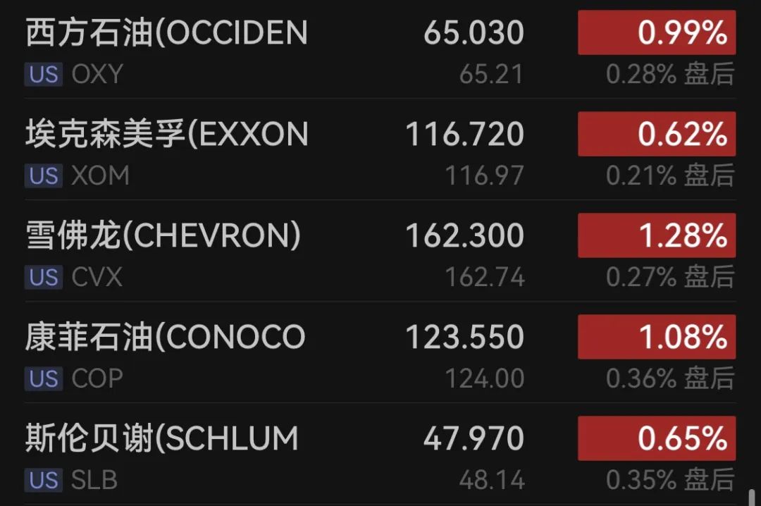 周一能源股普遍上涨,埃克森美孚涨0.62%,雪佛龙涨1.28%,康菲石油涨1.08%,斯伦贝谢涨0.65%,西方石油涨0.99%。