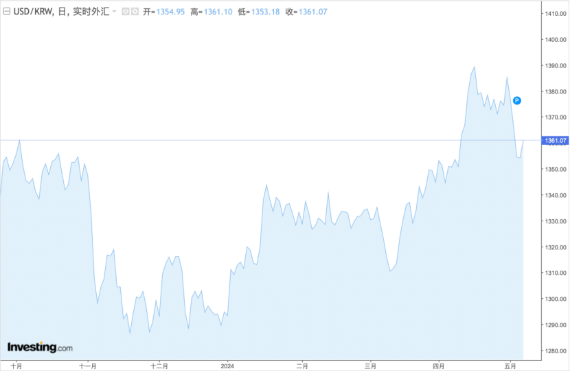 在韩国当局的出手干预之下,4月下旬,韩元兑美元汇率悄悄收复1400整数关口,截至5月7日,韩元兑美元汇率徘徊在1360附近。