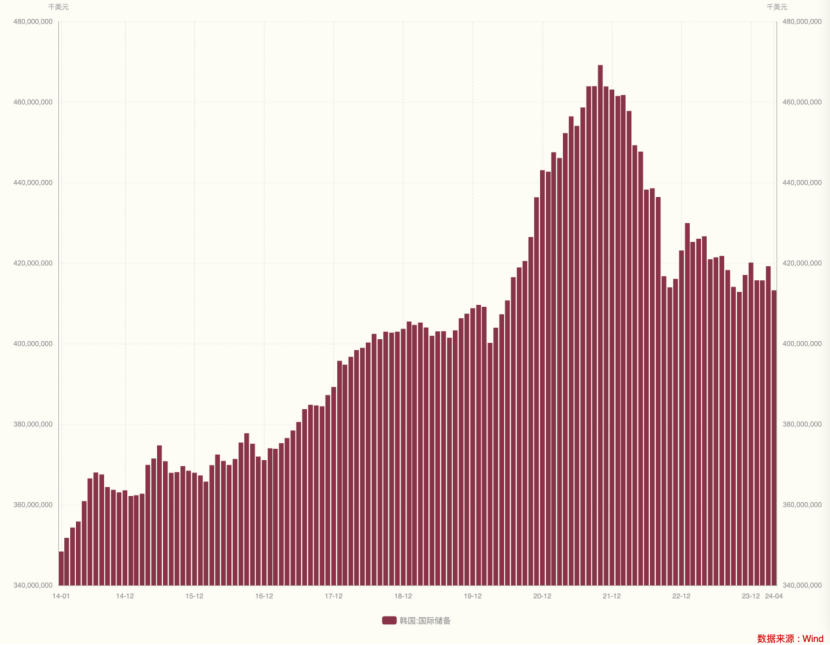 当地时间5月7日,韩国央行最新公布的数据显示,截至今年4月底,韩国外汇储备规模为4132.6亿美元,相比上月的4192.5亿美元减少了59.9亿美元,创下了19个月以来的最大降幅。