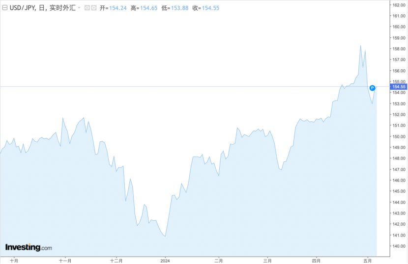 这使得,日元汇率大幅反弹,美元兑日元汇率从三十四年来的最高纪录160.245一度回落至151.86日元。截至目前,日元兑美元位于154.50日元一线,年内累计跌幅接近9%。