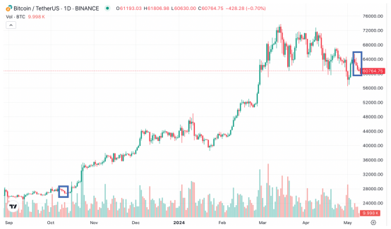 2024年5月9日,截至发稿,比特币小幅下跌。coinmarketcap数据显示,自比特币价格3月中旬创下73798美元的历史高点以后,其价格走势进入了持续2个月的震荡下行,目前价格徘徊在6.1万美元附近。