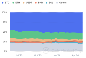(比特币市占率走势,蓝色为比特币。来源/coinmarketcap)