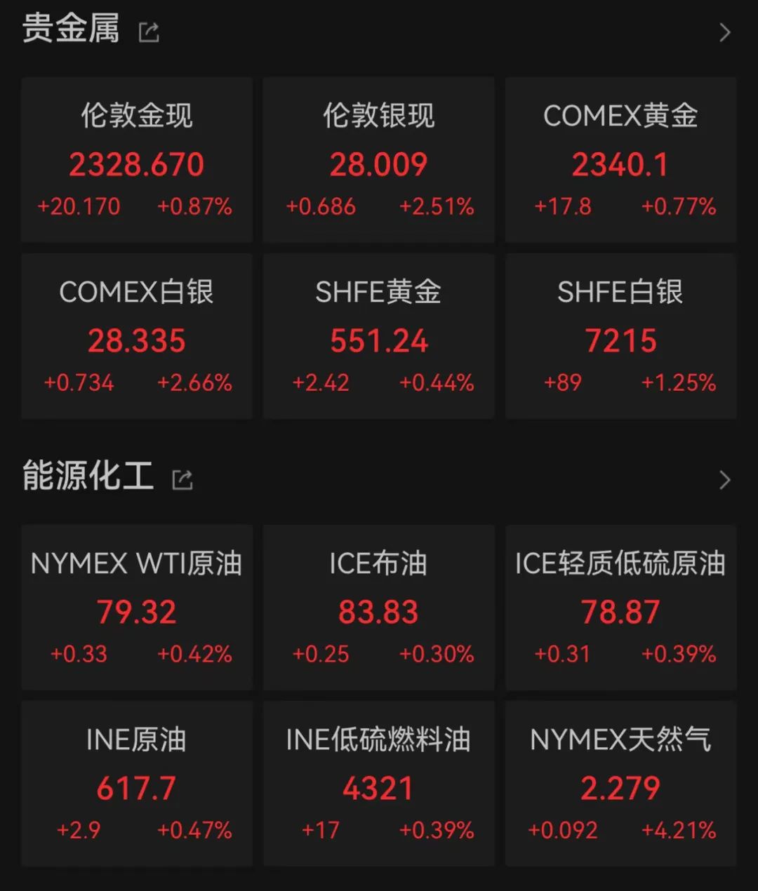 油价方面,WTI原油期货上涨0.42%,报79.32美元/桶;布伦特原油期货上涨0.30%,报83.83美元/桶。
