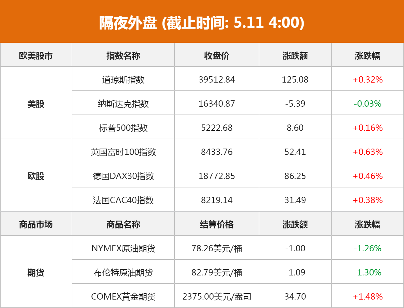 美股市场:美股三大指数收盘涨跌不一,道指日线录得八连涨。截至收盘,道琼斯工业平均指数比前一交易日上涨125.08点,收于39512.84点,涨幅为0.32%;标准普尔500种股票指数上涨8.60点,收于5222.68点,涨幅为0.16%;纳斯达克综合指数下跌5.40点,收于16340.87点,跌幅为0.03%。美股三大指数均连涨三周,本周,道指累涨2.16%,纳指累涨1.14%,标普500指数累涨1.85%。