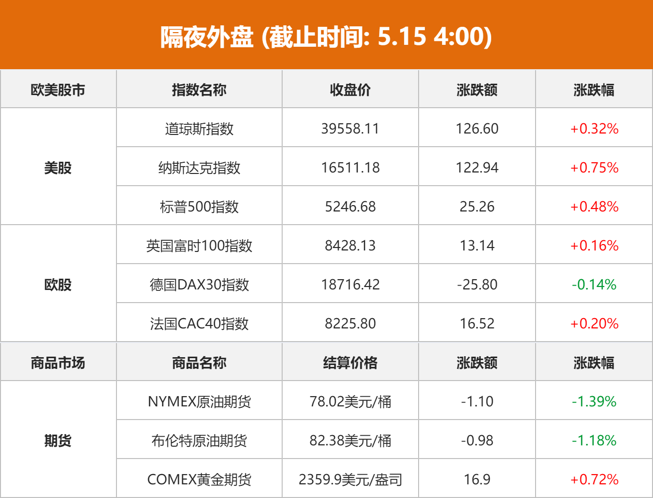 美股市场:美股三大指数集体收涨,纳指连续两日上涨、创收盘历史新高,截止收盘,道琼斯工业平均指数比前一交易日上涨126.60点,收于39558.11点,涨幅为0.32%;纳斯达克综合指数上涨122.94点,收于16511.18点,涨幅为0.75%;标准普尔500种股票指数上涨25.26点,收于5246.68点,涨幅为0.48%。美国4月份整体PPI和核心PPI均环比上升0.5%,高于市场预期,但由于3月份数据被下调,整体PPI和核心PPI的同比增幅与预期一致。