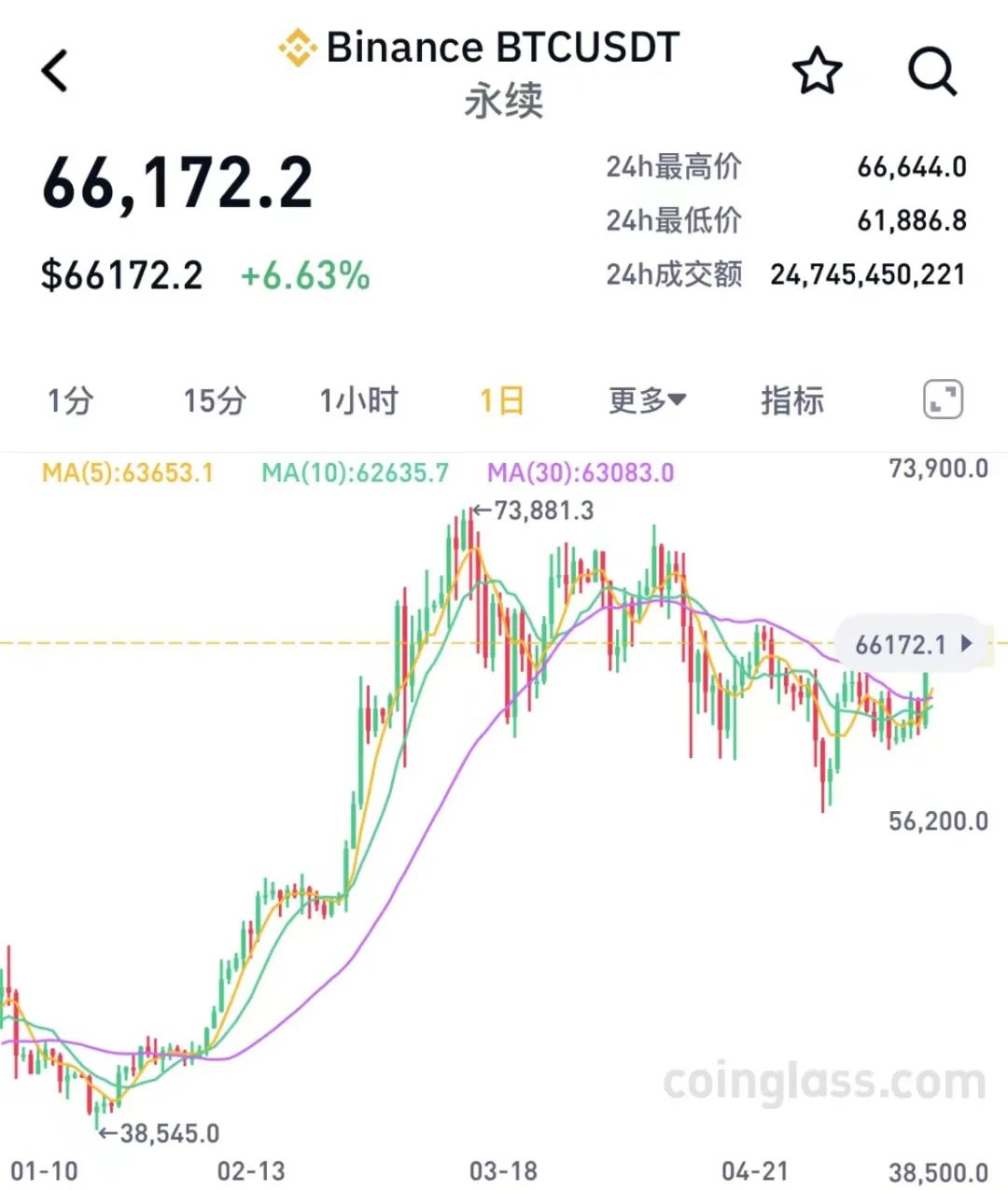 5月16日,比特币日内一度大涨超7%,突破66000美元。