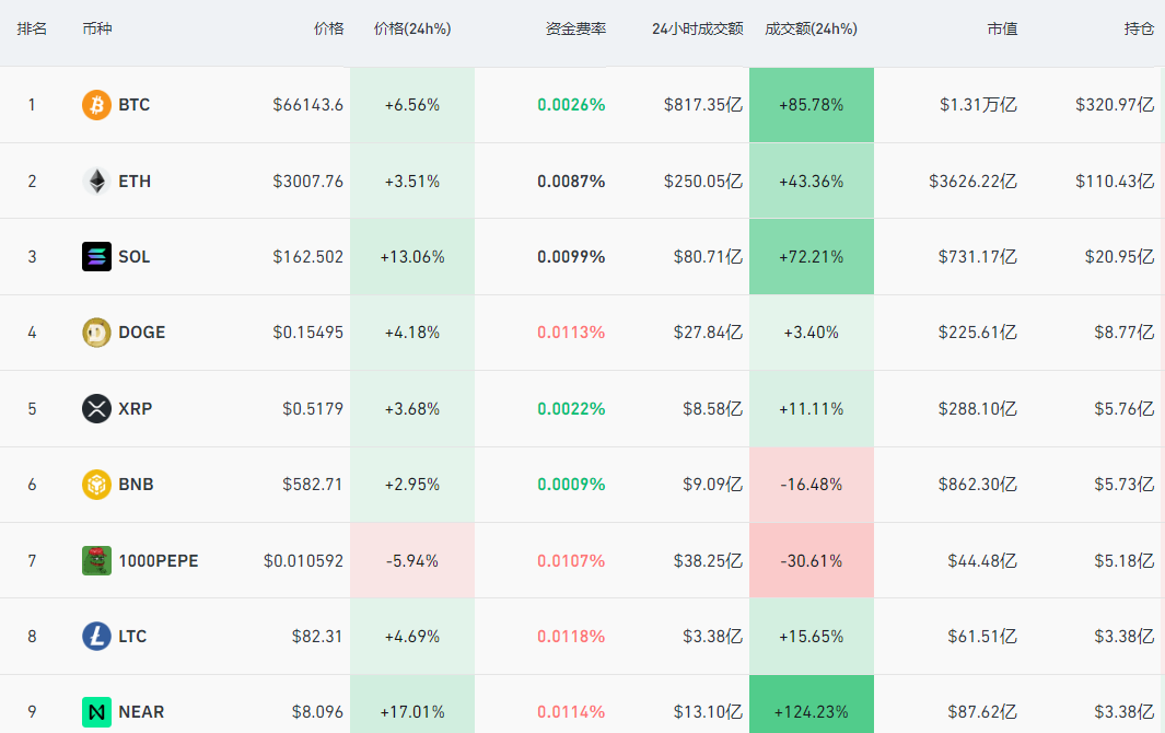 5月16日,比特币日内一度大涨超7%,站上66000美元,其他加密货币纷纷走强,更有多个品种暴涨超20%。
