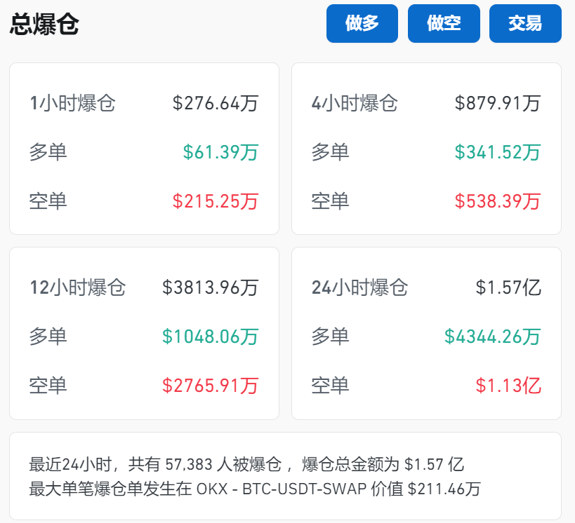 CoinGlass数据显示,最近24个小时,虚拟货币市场共有近6万人爆仓,爆仓总金额为1.57亿美元(约合11.33亿元人民币)。