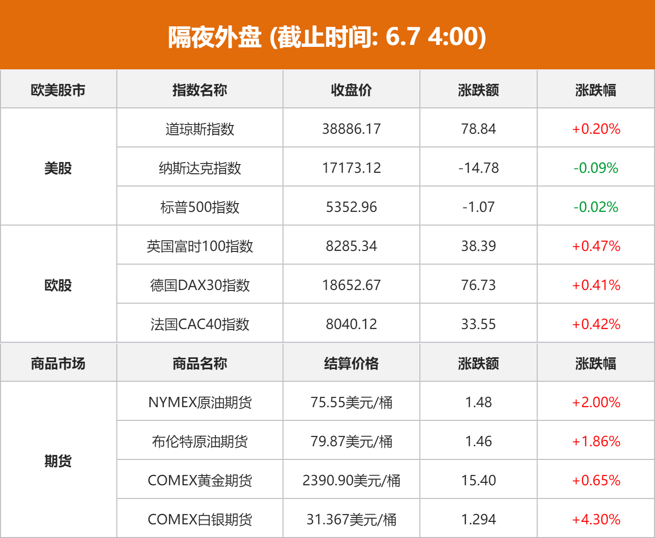 商品市场:国际油价6日上涨。截至当天收盘,纽约商品交易所7月交货的轻质原油期货价格上涨1.48美元,收于每桶75.55美元,涨幅为2%;8月交货的伦敦布伦特原油期货价格上涨1.46美元,收于每桶79.87美元,涨幅为1.86%。国际金价上涨,COMEX黄金期货8月合约上涨15.4美元,涨幅0.65%,报2390.90美元/盎司。国际银价大涨,COMEX白银期货主力合约上涨1.294美元,涨幅4.30%,报31.367美元/盎司。